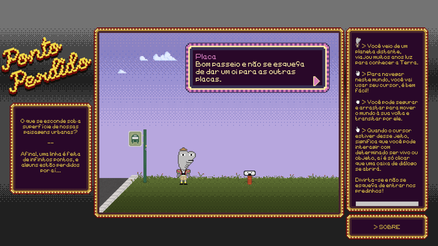 Ponto Perdido is a web game where you explore the city of Santos, São Paulo as an extraterrestrial being who has travelled from many light-years away to visit planet Earth.